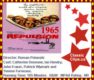 REPULSION (1965) Beautiful young manicurist Carole (Catherine Deneuve) suffers from androphobia (the pathological fear of interaction with men). When her sister and roommate, Helen (Yvonne Furneaux), leaves their London flat to go on an Italian holiday with her married boyfriend (Ian Hendry), Carole withdraws into her apartment. She begins to experience frightful hallucinations, her fear gradually mutating into madness. Director: Roman Polanski. Cast: Catherine Deneuve, Ian Hendry, John Fraser, Patrick Wymark and Yvonne Furneaux. |
