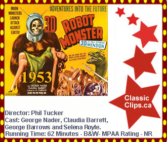 ROBOT MONSTER (1953) A gorilla-like space alien has been sent to Earth as the advance party of an impending invasion and wipes out the Earth's entire population - except for one family. Ordered by 'The Great One' to capture several humans, the Robot Monster becomes confused once it is smitten with the last young Earth female, and then, after talking to it's 'Great Leader' for instructions, finds it "must recalculate!" on how to progress in the final conquest of the Earth. Director: Phil Tucker. Cast: George Nader, Claudia Barrett, George Barrows and Selena Royle. |