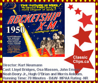 ROCKETSHIP X-M (1950) Amid a race to establish a lunar military base, the first manned spaceship bound for the moon veers off course and lands on Mars. Col. Floyd Graham (Lloyd Bridges) and his crew explore the planet, discover that it has been ravaged by bombs and theorize that it was once inhabited by a once-thriving society that destroyed itself. Trying to piece together what happened, the five astronauts detect high radiation levels -- and then come face-to-face with strange cavemen-like creatures. Director: Kurt Neumann. Cast: Lloyd Bridges, Osa Massen, John Emery, Noah Beery, Jr., Hugh O'Brian and Morris Ankrum. |