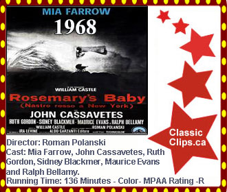 ROSEMARY'S BABY (1968) Desirous of starting a family, the young Catholic housewife, Rosemary Woodhouse, and her struggling actor husband, Guy, move into the Bramford: New York's iconic building that brims with unpleasant stories of obscure dwellers and ghastly occurrences. Before long, the young couple is befriended by their somehow eccentric next-door neighbours, Roman and Minnie Castevet, and, shortly after, Rosemary gets pregnant. However, little by little--as the inexperienced mother becomes systematically cut off from her circle and friends--alarming hints of a sinister and well-planned conspiracy begin to emerge. Director: Roman Polanski. Cast: Mia Farrow, John Cassavetes, Ruth Gordon, Sidney Blackmer, Maurice Evans and Ralph Bellamy. |