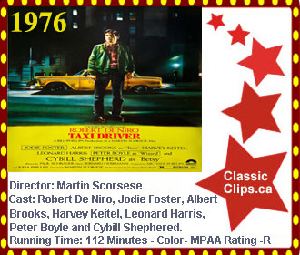 from reality as he dreams of cleaning up the filthy city. When Travis meets pretty campaign worker Betsy (Cybill Shepherd), he becomes obsessed with the idea of saving the world, first plotting to assassinate a presidential candidate, then directing his attentions toward rescuing 12-year-old prostitute named Iris (Jodie Foster). Director: Martin Scorsese. Cast: Robert De Niro, Jodie Foster, Albert Brooks, Harvey Keitel, Leonard Harris, Peter Boyle and Cybill Shepherd. |
