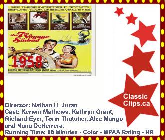 THE 7TH VOYAGE OF SINBAD (1958) Sailing to Baghdad after a narrow escape from the monster island of Colossa, the wedding plans of legendary hero Sinbad (Kerwin Mathews) and Princess Parisa (Kathryn Grant) are spoiled by the scheming sorcerer Sokurah (Torin Thatcher). In return for his previous help with the cyclops on Colossa, Sokurah demands that Sinbad retrieve a lamp he lost on the island. When Sinbad refuses, the conjurer shrinks Parisa, forcing the sailor and his crew back to the high seas in order to save her. Director: Nathan H. Juran. Cast: Kerwin Mathews, Kathryn Grant, Richard Eyer, Torin Thatcher, Alec Mango, and Nana DeHerrera. |