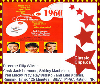 THE APARTMENT (1960) Insurance worker C.C. Baxter (Jack Lemmon) lends his Upper West Side apartment to company bosses to use for extramarital affairs. When his manager Mr. Sheldrake (Fred MacMurray) begins using Baxter's apartment in exchange for promoting him, Baxter is disappointed to learn that Sheldrake's mistress is Fran Kubelik (Shirley MacLaine), the elevator girl at work whom Baxter is interested in himself. Soon Baxter must decide between the girl he loves and the advancement of his career. Director: Billy Wilder. Cast: Jack Lemmon, Shirley MacLaine, Fred MacMurray, Ray Walston and Edie Adams. |