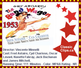 THE BAND WAGON (1953) Famous musical movie star Tony Hunter (Fred Astaire) fears his career may be on the skids, but his friends, Lester (Oscar Levant) and Lily (Nanette Fabray), have written a Broadway vehicle to kick-start his professional life. Tony is ecstatic -- until egotistical director Jeffrey Cordova (Jack Buchanan) joins the project and casts ballerina Gaby Gerard (Cyd Charisse) as the leading lady. Tony's second chance seems to be fading, but he may get more than he bargained for as the show goes on. Director: Vincente Minnelli. Cast: Fred Astaire, Cyd Charisse, Oscar Levant, Nanette Fabray, Jack Buchanan and James Mitchells. |