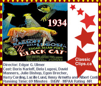 THE BLACK CAT (1934) Peter (David Manners) and Joan Allison (Julie Bishop) are honeymooning in Budapest when they meet mysterious scientist Dr. Vitus Verdegast. After a road accident in Hungary, the honeymooners and the enigmatic Dr Werdegast find refuge in the house of the famed architect Hjalmar Poelzig, who shares a dark past with the doctor. Director: Edgar G. Ulmer. Cast: Boris Karloff, Bela Lugosi, David Manners, Julie Bishop, Egon Brecher, Harry Cording, Lucille Lund, Henry Armetta and Albert Conti. |
