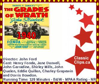 THE GRAPES OF WRATH (1940) The Joad clan, introduced to the world in John Steinbeck's iconic novel, is looking for a better life in California. After their drought-ridden farm is seized by the bank, the family - led by just-paroled son Tom (Henry Fonda) -- loads up a truck and heads West. On the road, beset by hardships, the Joads meet dozens of other families making the same trek and holding onto the same dream. Once in California, however, the Joads soon realize that the promised land isn't quite what they had hoped. Director: John Ford. Cast: Henry Fonda, Jane Darwell. John Carradine, Shirley Mills, John Qualen,, Eddie Quillan, Charley Grapewin and Dorris Bowdon. |