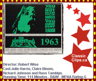 THE HAUNTING (1963) Dr. John Markway, an anthropologist with an interest in psychic phenomena, takes two specially selected women to Hill House, a reportedly haunted mansion. Eleanor (Julie Harris), a lonely, eccentric woman with a supernatural event in her past, and the bold Theodora (Claire Bloom), who has ESP, join John and the mansion's heir, cynical Luke (Russ Tamblyn). They are immediately overwhelmed by strange sounds and events, and Eleanor comes to believe the house is alive and speaking directly to her. Director: Robert Wise. Cast: Julie Harris. Claire Bloom, Richard Johnson and Russ Tamblyn. |