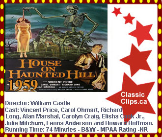 THE HOUSE ON HAUNTED HILL (1959) An accentric millionaire with theatrical tendencies invites a select group of people to stay overnight in his creepy house, which used to be an insane asylum. Stephen (Vincent Price), accompanied by his bitter wife, Evelyn (Carol Ohmart), offers a million dollars to anyone who can survive the entire night once the doors and windows are automatically locked and barred at the stroke of midnight, at which time they will have no other choice. When Stephen and Evelyn become trapped with their guests, they soon realize that the house really is haunted -- and the spirits dwelling within are very angry. Director: William Castle. Cast: Vincent Price, Carol Ohmart, Richard Long, Alan Marshal, Carolyn Craig, Elisha Cook Jr., Julie Mitchum, Leona Anderson and Howard Hoffman. |