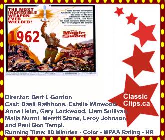 THE MAGIC SWORD (1962) Devious wizard Lodac (Basil Rathbone) abducts Princess Helene (Anne Helm). Young Sir George (Gary Lockwood) vows to rescue the fair maiden and win her heart in the process. George, who apprentices for a bumbling witch, nabs an enchanted sword from his boss's collection and makes off for Lodac's lair, only to find that the much more experienced Sir Branton (Liam Sullivan) is already on the case. Just as George tries to fend off Lodac and Branton, his secret weapon runs out of magic. Director: Bert I. Gordon. Cast: Basil Rathbone, Estelle Winwood, Anne Helm, Gary Lockwood, Liam Sullivan, Maila Nurmi, Merritt Stone, Leroy Johnson and Paul Bon Tempi. |