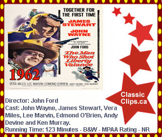 THE MAN WHO SHOT LIBERTY VALANCE (1962) Questions arise when Senator Stoddard (James Stewart) attends the funeral of a local man named Tom Doniphon (John Wayne) in a small Western town. Flashing back, we learn Doniphon saved Stoddard, then a lawyer, when he was roughed up by a crew of outlaws terrorizing the town, led by Liberty Valance (Lee Marvin). As the territory's safety hung in the balance, Doniphon and Stoddard, two of the only people standing up to him, proved to be very important, but different, foes to Valance. Director: John Ford. Cast: John Wayne, James Stewart, Vera Miles, Lee Marvin, Edmond O'Brien, Andy Devine and Ken Murray. |