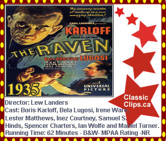 THE RAVEN (1935) A brilliant but deranged brain surgeon seeks revenge on the woman who spurned his marriage proposal. With the help of an escaped convict, he traps the girl, her father, and her boyfriend in his torture chamber. Director: Lew Landers. Cast:Boris Karloff, Bela Lugosi, Irene Ware, Lester Matthews, Inez Courtney, Samuel S. Hinds, Spencer Charters, Ian Wolfe and Maidel Turner. |