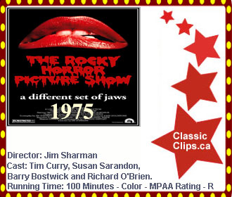 THE ROCKY HORROR PICTURE SHOW (1975) Ssweethearts Brad (Barry Bostwick) and Janet (Susan Sarandon), stuck with a flat tire during a storm, discover the eerie mansion of Dr. Frank-N-Furter (Tim Curry), a transvestite scientist. As their innocence is lost, Brad and Janet meet a houseful of wild characters, including a rocking biker (Meat Loaf) and a creepy butler (Richard O'Brien). Through elaborate dances and rock songs, Frank-N-Furter unveils his latest creation: a muscular man named "Rocky." Director: Jim Sharman. Cast: Tim Curry, Susan Sarandon, Barry Bostwick and Richard O'Brien. |