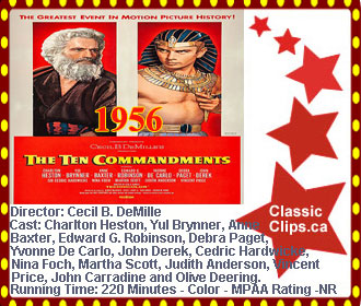 THE TEN COMMANDMENTS (1956) Moses, from the time he was discovered in the bullrushes as an infant by the pharoah's daughter, to his long, hard struggle to free the Hebrews from their slavery at the hands of the Egyptians. Moses (Charlton Heston) starts out "in solid" as Pharoah's adopted son (and a whiz at designing pyramids, dispensing such construction-site advice as "Blood makes poor mortar"), but when he discovers his true Hebrew heritage, he attempts to make life easier for his people. Banished by his jealous half-brother Rameses (Yul Brynner), Moses returns fully bearded to Pharoah's court, warning that he's had a message from God and that the Egyptians had better free the Hebrews post-haste if they know what's good for them. Only after the Deadly Plagues have decimated Egypt does Rameses give in - but only temporarily. As the Hebrews reach the Red Sea, they discover that Rameses has gone back on his word and plans to have them all killed. But Moses rescues his people by parting the Seas. Later, Moses is again confronted by God on Mt. Sinai, who delivers unto him the Ten Commandments. Meanwhile, the Hebrews, led by the duplicitous Dathan (Edward G. Robinson), forget their religion and begin behaving like heathens. They are subsequently judged (killed) by God and the remnant of the Hebrews are then made to wonder in the wilderness for forty years to atone for their sin before crossing over the Jordan River to the promised land of 'Milk and Honey.' Director: Cecil B. DeMille. Cast: Charlton Heston, Yul Brynner, Anne Baxter, Edward G. Robinson, , Debra Paget, Yvonne De Carlo, John Derek, Cedric Hardwicke, Nina Foch, Martha Scott, Judith Anderson, Vincent Price, John Carradine and Olive Deering. |