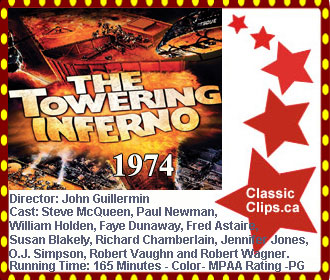 THE TOWERING INFERNO (1974) Faulty wiring leads to an electrical fire in a storage room on the 81st floor of the world's tallest skyscraper (138 floors) on the eve of its ceremonial opening. The fire quickly rages out of control and begins to climb through the 'Glass Tower's' upper floors, trapping an entourage of celebrities, big-wigs and other dignitaries (either involved in the building's construction or there as distinguished guests) on the 135 floor - 'The Promenade Room.' After many casualties, including firemen, who have evacuated the lower floors, and every attempt exhausted in order to rescue those trapped in the Promenade Room fails, one last desperate plan is enacted to save their lives, but which ultimately kills many of them first. Producer: Irwin Allen. Director: John Guillermin. Cast: Steve McQueen, Paul Newman, William Holden, Faye Dunaway, Fred Astaire, Susan Blakely, Richard Chamberlain, Jennifer Jones, O.J. Simpson, Robert Vaughn, Robert Wagner, Susan Flannery, Greogory Sierra and Dabney Colemano. |
