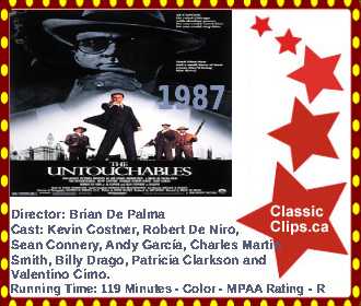THE UNTOUCHABLES (1987) Based on a True Story: After building an empire with bootleg alcohol, legendary crime boss Al Capone (Robert De Niro) rules Chicago with an iron fist. Though Prohibition agent Eliot Ness (Kevin Costner) attempts to take Capone down, even his best efforts fail due to widespread corruption within the Windy City's police force. Recruiting an elite group of lawmen who won't be swayed by bribes or fear, including Irish-American cop Jimmy Malone (Sean Connery), Ness renews his determination to bring Capone to justice. Director: Brian De Palma. Cast: Kevin Costner, Robert De Niro, Sean Connery, Andy GarcĂa, Charles Martin Smith, Billy Drago, Patricia Clarkson and Valentino Cimo. |