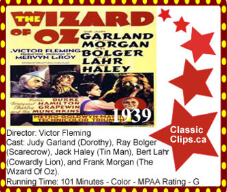 THE WIZARD OF OZ (1939) Dorothy (Judy Garland), lives on a farm in Kansas until a cyclone arrives, and picks her, her house, and her dog up and deposits them in the land of Oz. Things in Oz are strange and beautiful, but Dorothy just wants to get back home. She's helped by the Good Witch of the North, but she's also in trouble with the Wicked Witch of the West, who seeks revenge for the death of her sister; the Wicked Witch of the East, for which she blames Dorothy. Now more desparate than ever to return home, Dorothy begins to travel to the Emerald City where a great wizard lives. On her way she meets a Scarecrow who needs a brain, a Tin Man who wants a heart, and a Cowardly Lion who desperately needs courage. They all hope the Wizard of Oz will help them (especially Dorothy), before the Wicked Witch of the West catches up with them. Director: Victor Fleming. Cast: Judy Garland (Dorothy), Ray Bolger (Scarecrow), Jack Haley (Tin Man), Bert Lahr (Cowardly Lion), Frank Morgan (The Wizard Of Oz), Billie Burke (Glinda, The Good Witch Of The North), Margaret Hamilton (The Wicked Witch Of The West), and 'Terry The Dog' (Toto). |