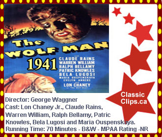 THE WOLFMAN (1941) At some time in the early twentieth century, after learning of the death of his brother, Larry Talbot (Lon Chaney Jr.) returns to his ancestral home in Llanwelly, Wales, to reconcile with his estranged father, Sir John Talbot (Claude Rains). While there, Larry becomes romantically interested in a local girl named Gwen Conliffe (Evelyn Ankers), who runs an antique shop. As a pretext to converse with her, he purchases a silver-headed walking stick decorated with a wolf. Gwen tells him that it represents a werewolf (which she defines as a man who changes into a wolf "at certain times of the year"). Larry dismisses this as childish folklore, but soon realizes the terrifying truth after being bitten by a wolf himself. Director: George Waggner. Cast: Lon Chaney Jr., Claude Rains, Warren William, Ralph Bellamy, Patric Knowles, Bela Lugosi and Maria Ouspenskaya. |