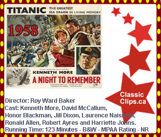 TITANIC - A NIGHT TO REMEMBER (1958) The sinking of the Titanic is presented in a highly realistic fashion in this tense British drama. The disaster is portrayed largely from the perspective of the ocean liner's second officer, Charles Lightoller (Kenneth More). Despite numerous warnings about ice, the ship sails on, with Capt. Edward John Smith (Laurence Naismith) keeping it going at a steady clip. When the doomed vessel finally hits an iceberg, the crew and passengers discover that they lack enough lifeboats, and tragedy follows. Director: Roy Ward Baker. Cast:Kenneth More, David McCallum, Honor Blackman, Jill Dixon, Laurence Naismith, Ronald Allen, Robert Ayres and Harriette Johns. |
