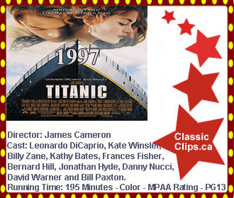 TITANIC (1997) First-class Rose (Kate Winslet) boards the luxurious Ocean Liner, Titanic, with her overbearing mother (Frances Fisher) and her well-to-do fiancé, Cal (Billy Zane), whom she is marrying for financial reasons. Distraught by the pressure of her arranged marriage, Rose contemplates suicide on the ship’s stern. She is talked down by Third-class passenger Jack Dawson (Leonardo DiCaprio), a handsome but penniless artist. Over the course of the voyage, she becomes increasingly attracted to Jack. Meeting in secret, Rose asks him to draw her in the nude wearing only the Heart of the Ocean necklace, which was a gift from Cal. Rose and Jack subsequently make love, and Rose tells Jack that she will go with him once the ship docks. Later that night, however, the Titanic is struck by an iceberg and begins to sink and Rose now must decide to face certain death with her new found love Jack, or her controlling and jealous fiancé, Cal. Director: James Cameron. Cast: Leonardo DiCaprio, Kate Winslet, Billy Zane, Kathy Bates, Frances Fisher, Bernard Hill, Jonathan Hyde, Danny Nucci, David Warner and Bill Paxton. |