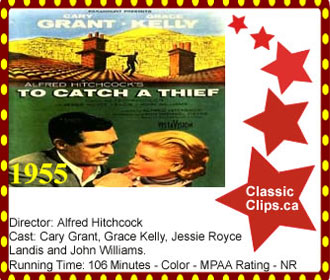 TO CATCH A THIEF (1955) A series of ingenious jewelry robberies takes place on the French Riviera. The police suspect John Robbie (Cary Grant), an expert thief who was known as "The Cat" before he retired from crime. Robbie enlists the help of an insurance man to guess where the real thief will strike next. He befriends wealthy widow, Jessie Stevens and her attractive daughter Frances Stevens (Grace Kelly), who insists that John Robbie is in fact the real thief behind the French Riviera robberies. Director: Alfred Hitchcock. Cast: Cary Grant, Grace Kelly, Jessie Royce Landis and John Williams. |