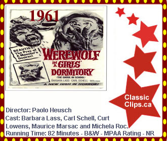 WEREWOLF IN A GIRLS' DORMITORY (1961) Wolves have been roaming around a girls' reformatory. When the girls begin to get murdered, suspicion focuses on both the wolves and on a handsome, newly hired science teacher, who might be a werewolf. Director: Paolo Heusch. Cast: Barbara Lass, Carl Schell, Curt Lowens, Maurice Marsac and Michela Roc. |