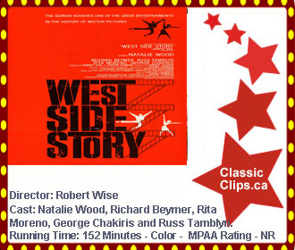 WEST SIDE STORY (1961) A musical in which a modern day Romeo and Juliet are involved in New York street gangs. On the harsh streets of the upper west side, two gangs battle for control of the turf. The situation becomes complicated when a gang members falls in love with a rival's sister. Director: Robert Wise. Cast: Natalie Wood, Richard Beymer, Rita Moreno, George Chakiris and Russ Tamblyn. |