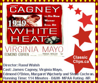 WHITE HEAT (1949) A federal agent poses as a thug and is sent to prison to infiltrate psychopathic hoodlum Cody Jarrett (James Cagney), doing a 2 year stint and who is soon to be released, to ascertain him and his gang's next criminal exploits. Director: Raoul Walsh. Cast: James Cagney, Virginia Mayo, Edmond O'Brien, Margaret Wycherly and Steve Cochran. |